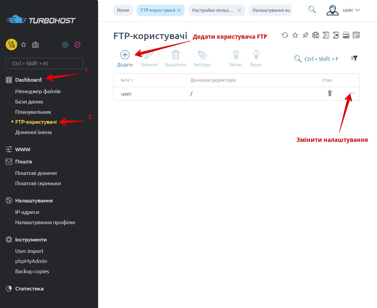 Для того щоб додати, змінити або налаштувати користувача FTP, Вам необхідно зайти в панель управління Вашим хостингом: